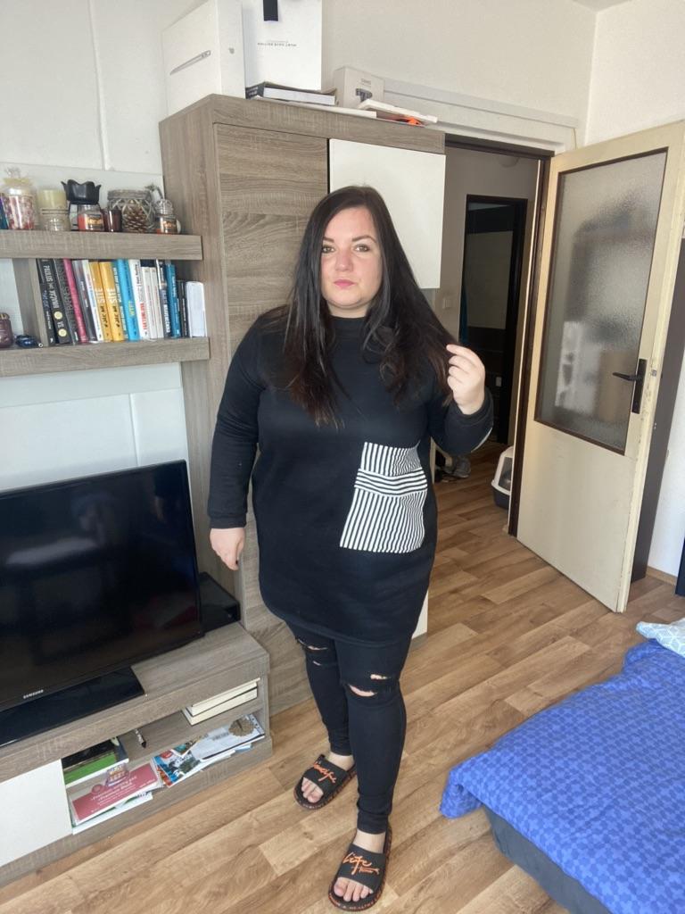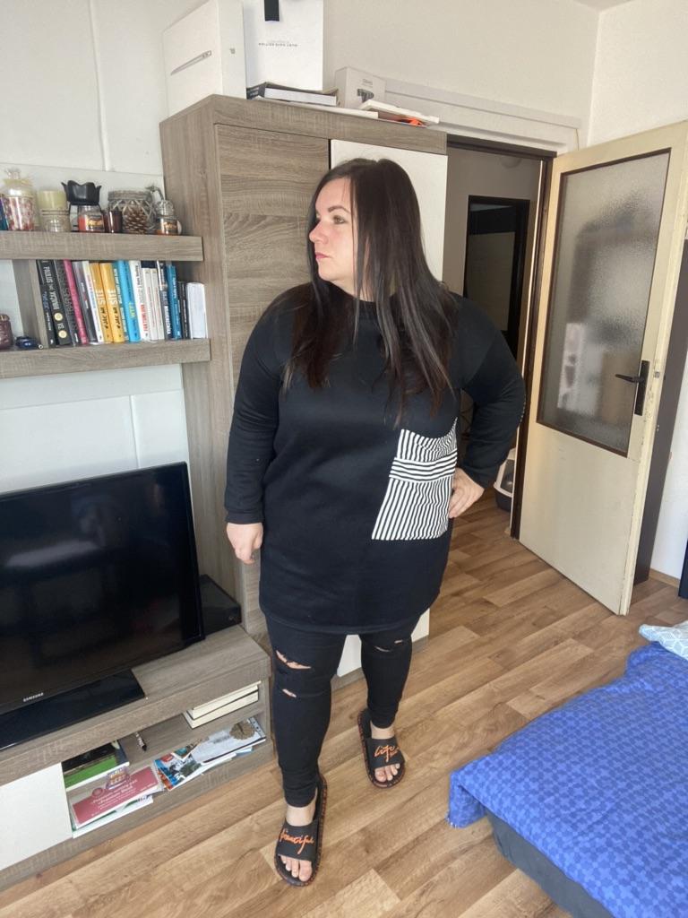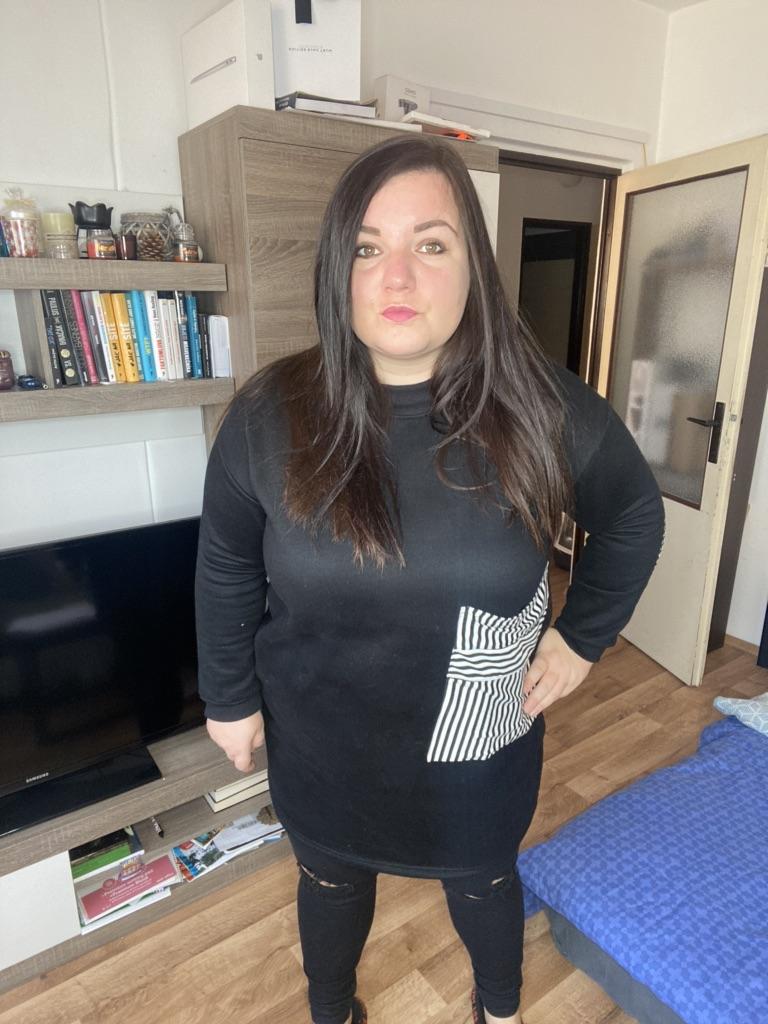 Mikina je super Je originální Materiál je příjemný a teplý Na hubené slečně může být vhodná i jako šaty