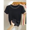 Women's Summer Short Sleeve Knitted T-shirt New Fashion O Neck Beaded Knit Elegant Short Top Female Casual Simple Solid Color Ladies Tshirt 3112
