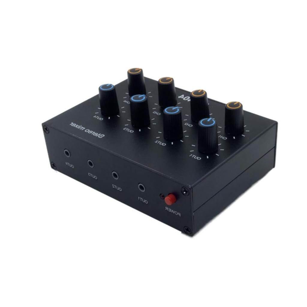 4-input, 4-output audio mixer: This stereo dual-channel 4-input, 4-output audio mixer features four 3.5mm AUX input channels and four 3.5mm AUX output channels. It supports one input and four simultaneous outputs. When two or more channels are input, the audio will be mixed and output. This allows you to easily mix AUX audio signals from DVD players, CD players, musical instruments, etc.