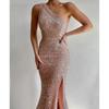 Γυναικεία μόδα, σέξι χρυσό, πασπαλισμένο με έναν ώμο, βραδινό φόρεμα με διαμάντι