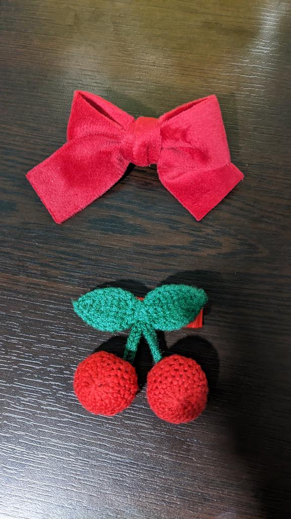 Cherries are super cute 🥰 but a bow is pinkish in real life. They can't be worn as a set