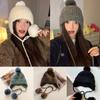 Autumn Winter Warm Knitted Hats Women Cute Cartoon Beanie Balls Two Plush Earflap Thicken Antle V0C8