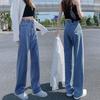 Moteriški aukšto liemens mėlyni tiesūs džinsai: 2023 m. vasaros plataus kirpimo šluojamos kelnės dizainas