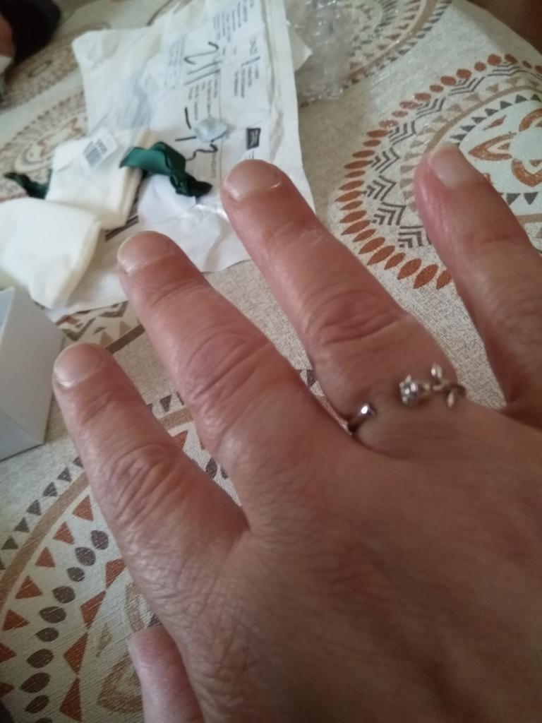 Den er veldig tynn og pen. Jeg likte den veldig godt. Den ser best ut på lillefingeren.