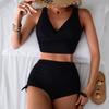 Korean Style Women's Fashion 3 Pieces Printed Swimwear Set Padded Round Collar Top Boy Shorts Ruffled Drawstring Skirt Swimsuit Modest Bathing Suit