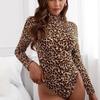 SCIONE Women Tight High Waist Knit Casual Jumpsuit High Collar Long Sleeve Sexy Leopard Jumpsuit