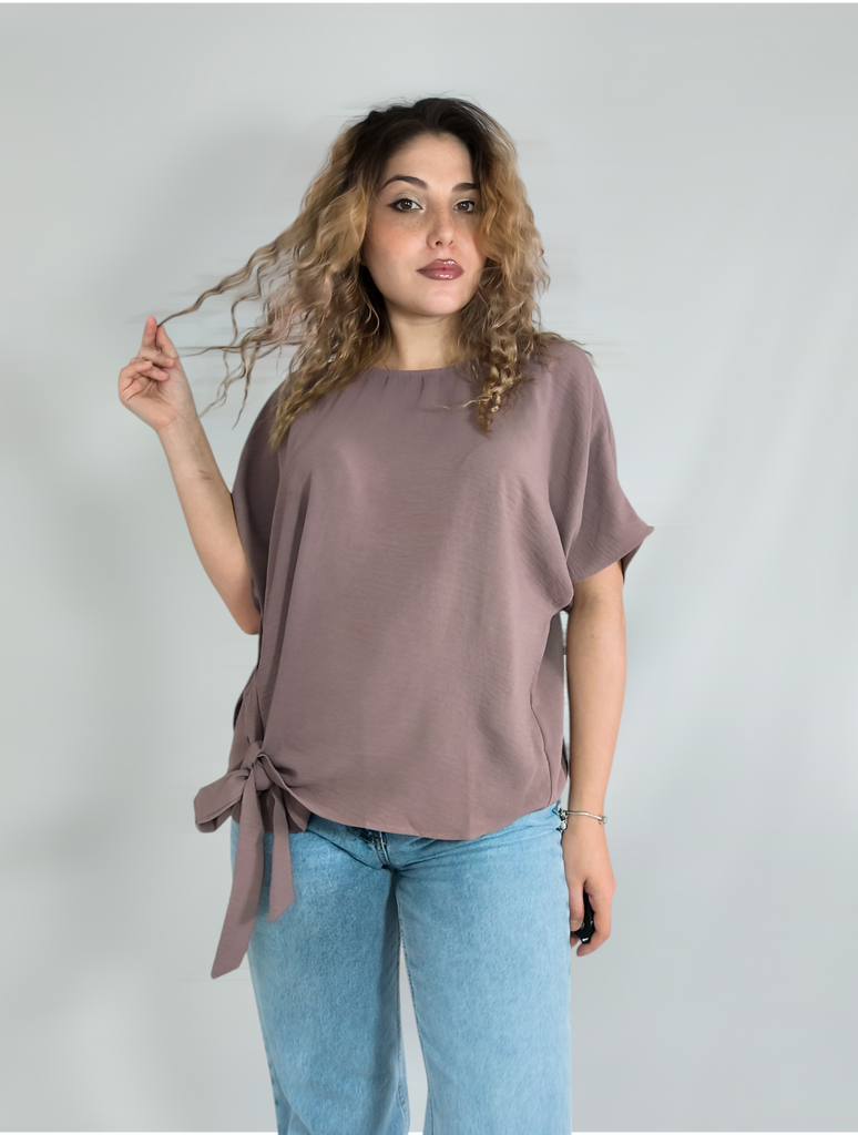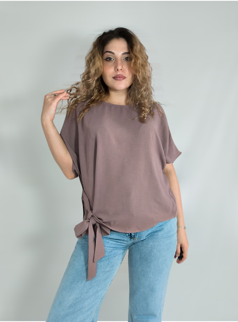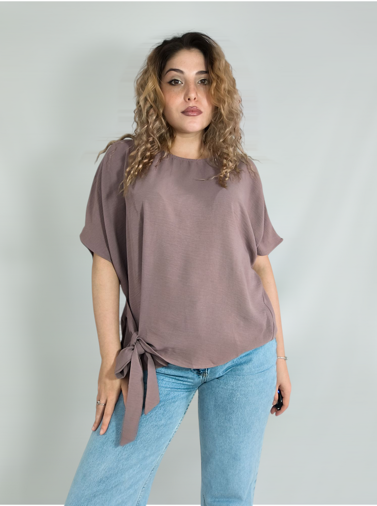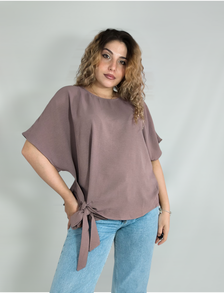 Sommer-T-skjorte for kvinner Ensfarget flaggermus-ermet Hem Knot Løs Kortermet Topp