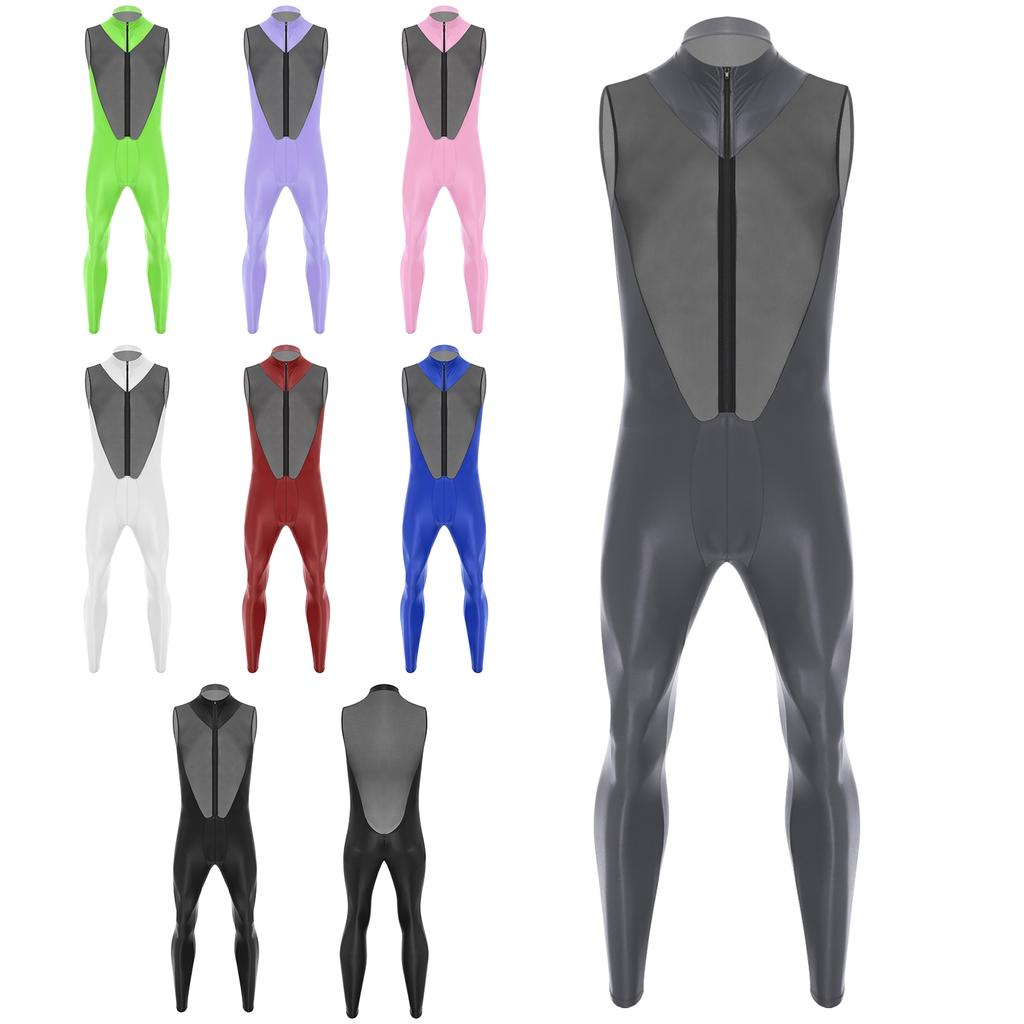 Mens Glossy Sheer Mesh Jumpsuit Front Zipper Sleeveless Design Zipper Crotch Long Leg Catsuit
