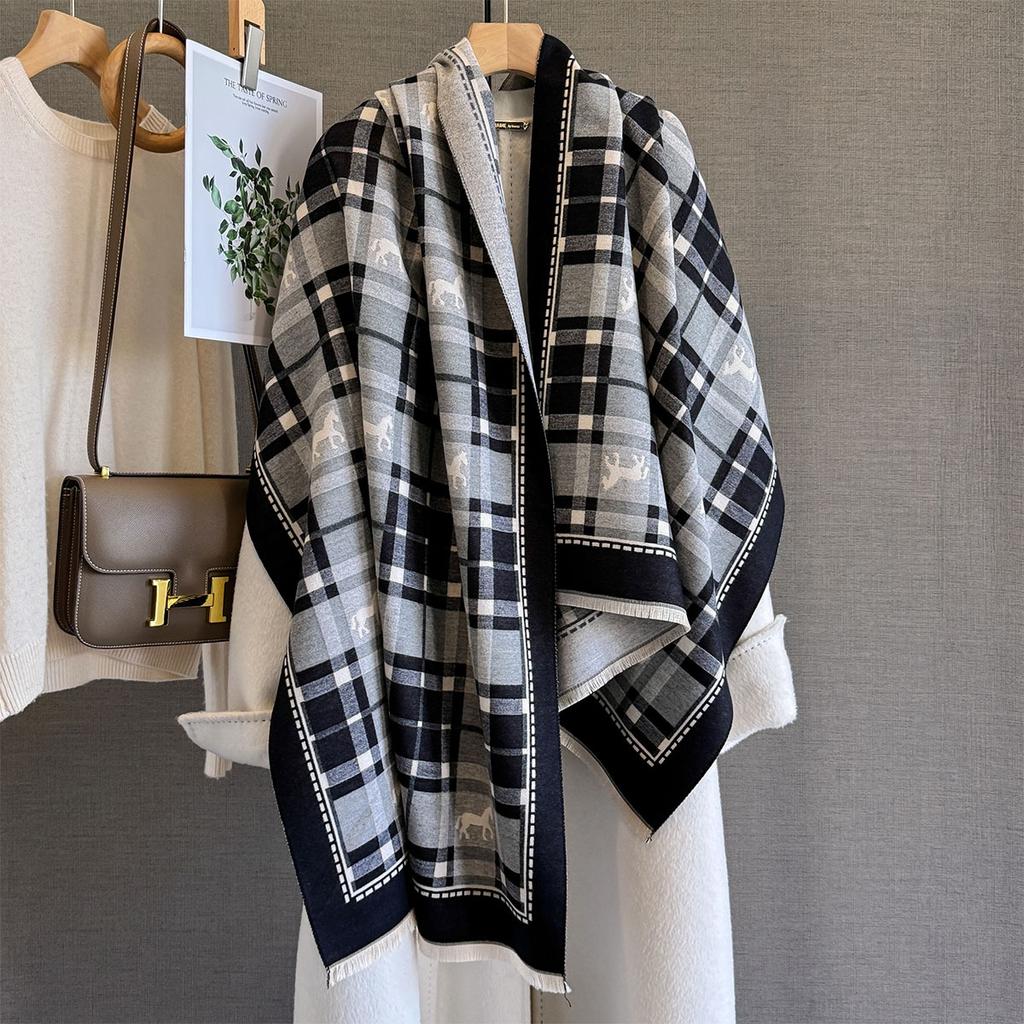 Autumn and winter pony light luxury fashion plaid shawl women's versatile warm windproof thickened medium and long jacquard scarf