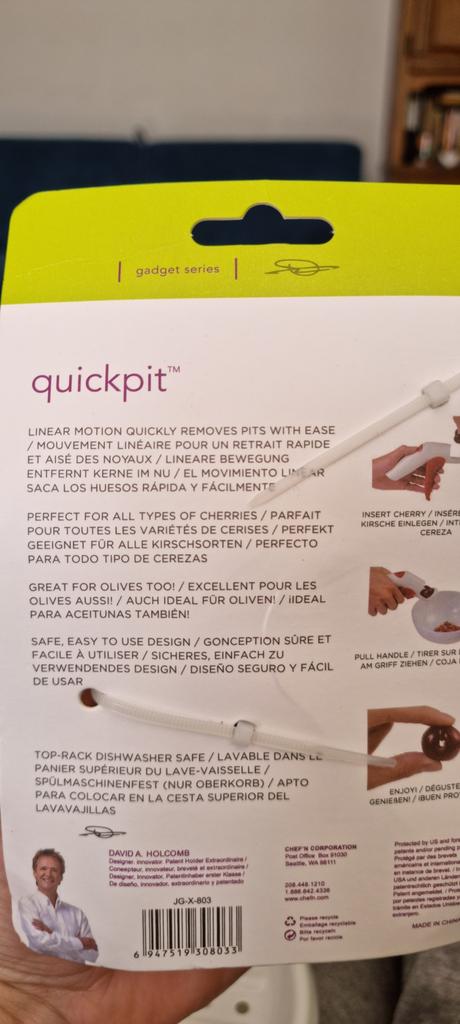 Narzędzie beznadziejne popychacz pestek pokruszony na końcu. Szkoda że nie można spróbować bo nie ma wiśni. Nie polecam bardzo drogi w porównaniu do automatu z pojemnikiem. Zgłaszałem że to złe narzędzie to kazano mi wypróbować na owocach i nie uznano zwrotu kasy.